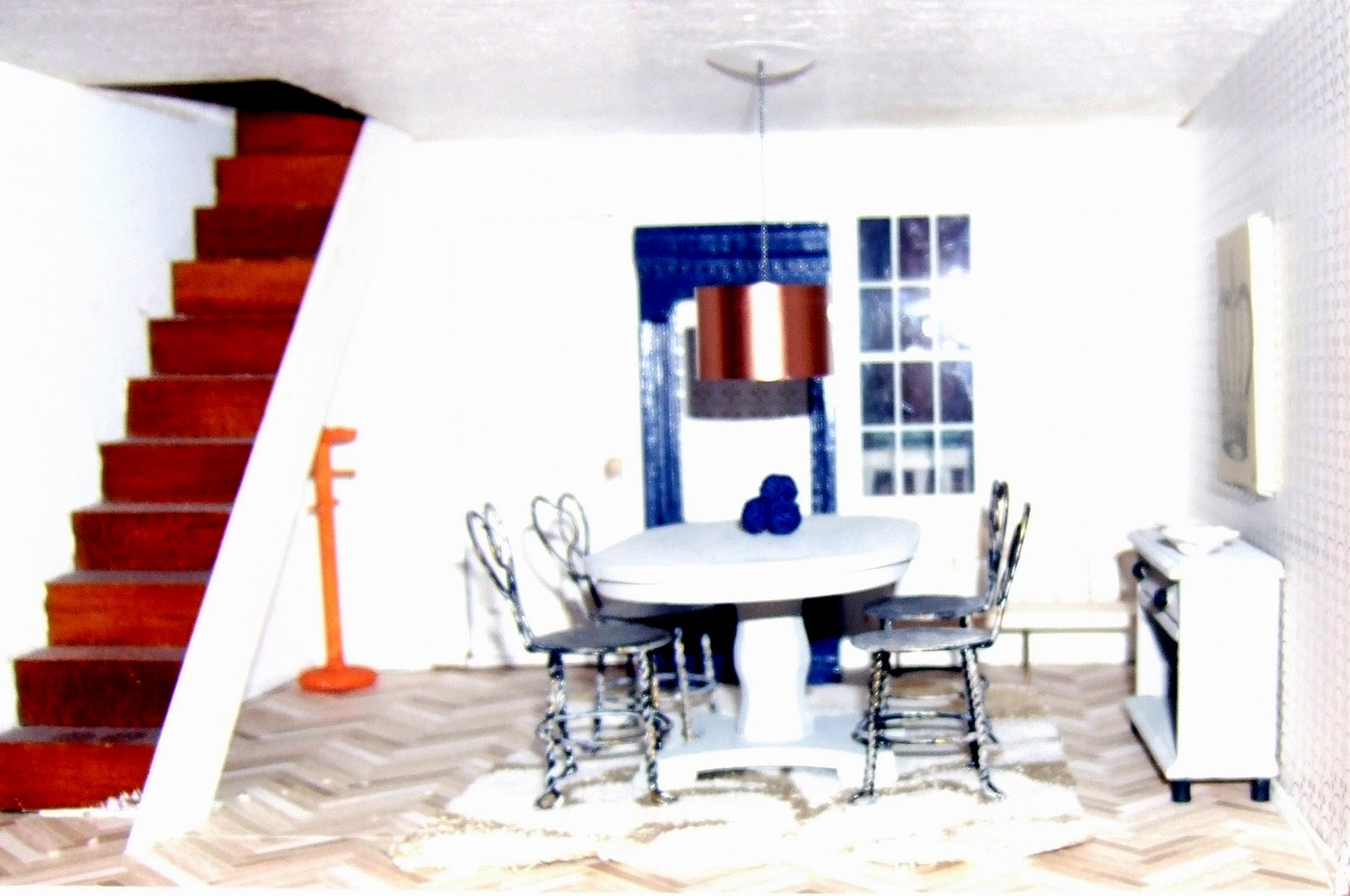 The dining room rug is actually a washcloth. The coffee table is a bracelet, I cut a piece of plexiglass to fit the top of it. And the garden stool was a little wooden barrel I found at Michaels. I just painted it orange and used a Sharpee to draw the cut-outs.