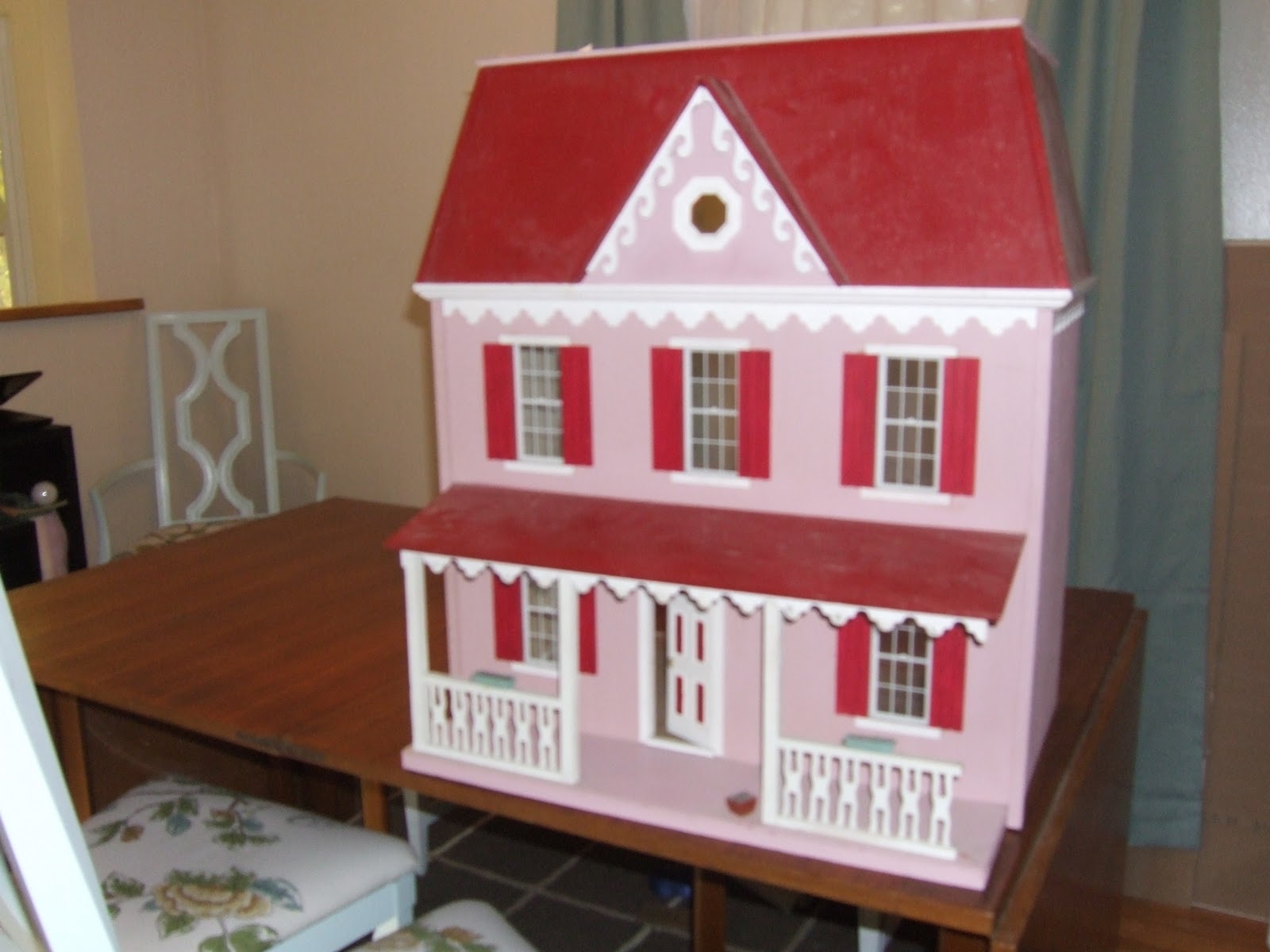 My first post on Little Victorian is about a little colonial. A very little colonial. Ever since seeing Emily Henderson’s “I Am A Giant” challenge, I laid in bed thinking about minis. Almost every piece of fabric or cardboard scrap I’ve seen, I’ve thought about things I could make out of it for a dollhouse. I found a house on CL and had my heart set on it, but by the time I decided to buy it, it was already sold, and so were the next 4 that I liked. I tried to make a dollhouse from scratch, but it kind of sucked the fun out of it for me, so I stopped and gave up. But, today I decided to go to Goodwill one more time. And there it was. It was painted so bright pink that when I walked past it, I assumed it was a silly plastic one, but when I did a double take and saw the wood and the shutters and the front porch and the three stories and wooden staircases, I grabbed it as fast as I could and ran to the check out line.