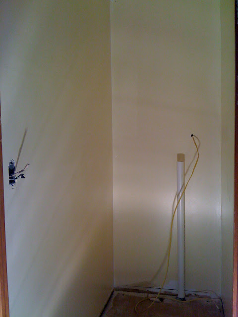 We removed the plumbing, installed an overhead light, ran wiring and installed an outlet. I scored on a gallon of sunny yellow, semi-gloss “Oops” for only $5 and re-painted.