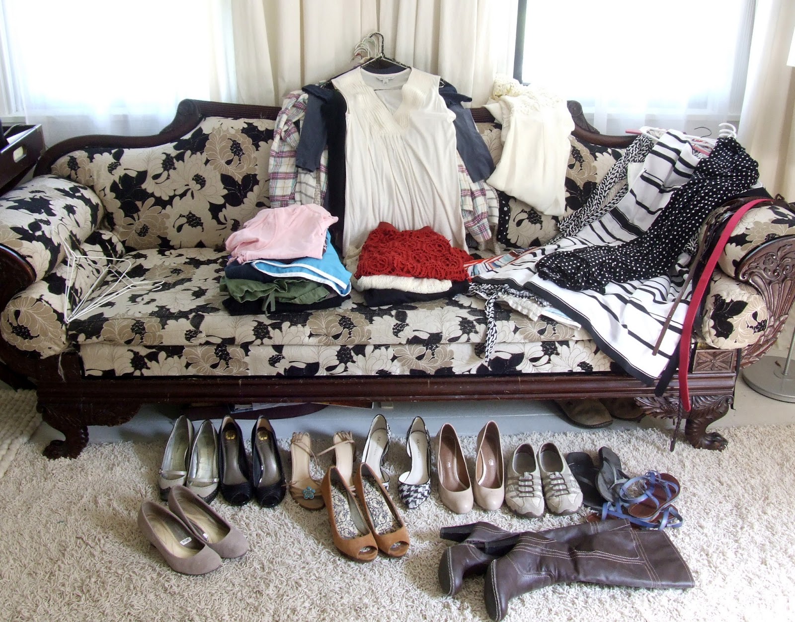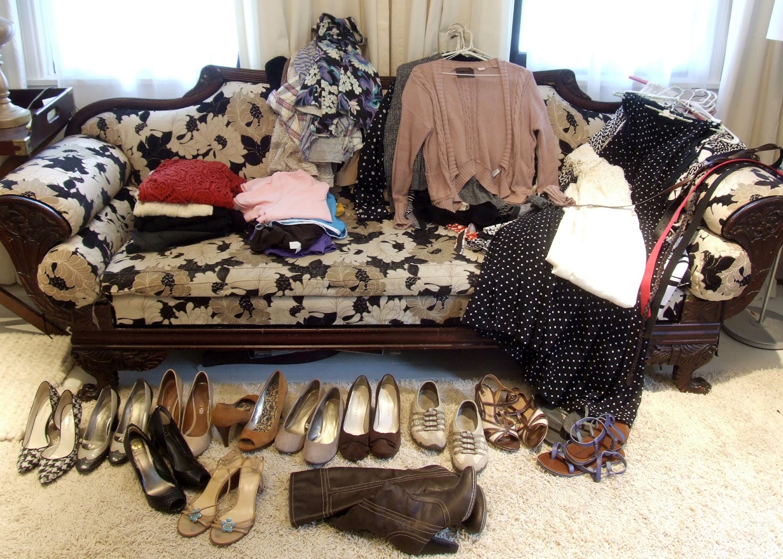 I started by bringing every last item of clothing and shoes down to the living room. It was easier to be ruthless when I couldn’t just turn around and put items back in the closet.